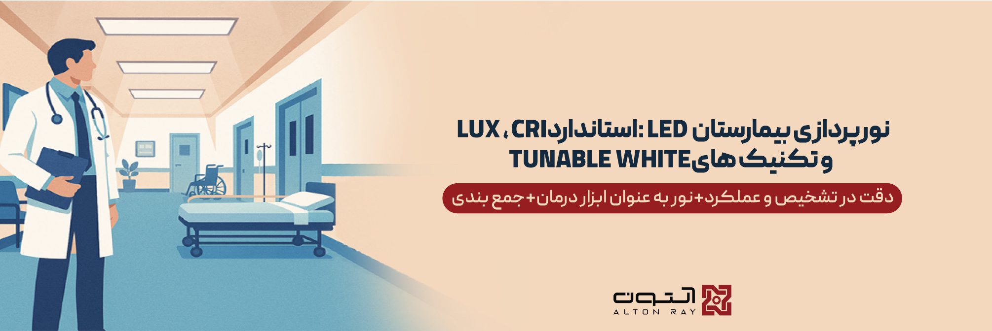| اتاق بیمار (نور عمومی) | ۱۰۰ – ۲۰۰ Lux | ۸۰+ | ۳۰۰۰K (شب ۲۷۰۰K) | Tunable White، UGR < 22 |