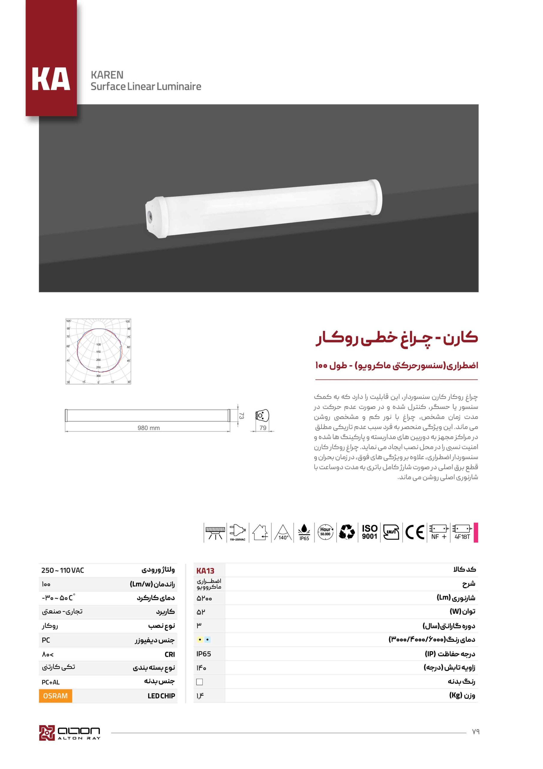 چراغ روکار کارن سنسوردار، این قابلیت را دارد که به کمک سنسور یا حسگر، کنترل شده و در صورت عدم حرکت در مدت زمان مشخص، چراغ با نور کم و مشخصی روشن می ماند. این ویژگی منحصر به فرد سبب عدم تاریکی مطلق در مراکز مجهز به دوربین های مداربسته و پارکینگ ها شده و امنیت نسبی را در محل نصب ایجاد می نماید. چراغ روکار کارن سنسوردار اضطراری، علاوه بر ویژگی های فوق، در زمان بحران و قطع برق اصلی در صورت شارژ کامل باتری به مدت دو ساعت با شارنوری اصلی روشن می ماند.