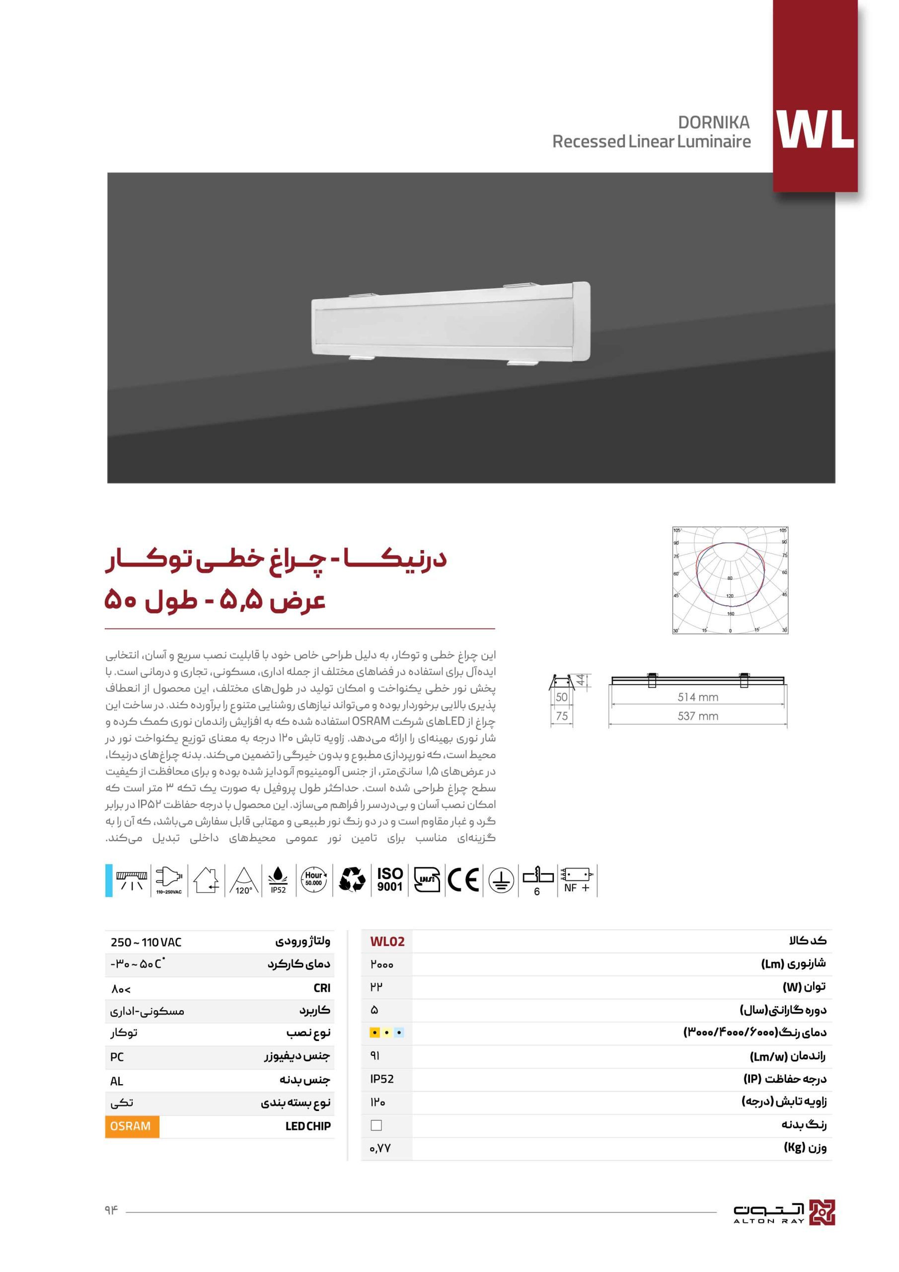این چراغ خطی و توکار، به دلیل طراحی خاص خود با قابلیت نصب سریع و آسان، انتخابی ایدهآل برای استفاده در فضاهای مختلف از جمله اداری، مسکونی، تجاری و درمانی است. با پخش نور خطی یکنواخت و امکان تولید در طولهای مختلف، این محصول از انعطافپذیری بالایی برخوردار بوده و میتواند نیازهای روشنایی متنوع را برآورده کند. در ساخت این چراغ از LEDهای شرکت OSRAM استفاده شده که به افزایش راندمان نوری کمک کرده و شار نوری بهینهای را ارائه میدهد. زاویه تابش 120 درجه به معنای توزیع یکنواخت نور در محیط است، که نورپردازی مطبوع و بدون خیرگی را تضمین میکند. بدنه چراغهای درنیکا، در عرضهای ۱٫۵ سانتیمتر، از جنس آلومینیوم آنودایز شده بوده و برای محافظت از کیفیت سطح چراغ طراحی شده است. حداکثر طول پروفیل به صورت یک تکه 3متر است که امکان نصب آسان و بی دردسر را فراهم می سازد. این محصول با درجه حفاظت IP52 در برابر گرد و غبار مقاوم است و در دو رنگ نور طبیعی و مهتابی قابل سفارش می باشد، که آن را به گزینه ای مناسب برای تامین نور عمومی محیط های داخلی تبدیل می کند.